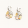 Each earring features fan-shaped petals in gold, rose, and silver hues, framed by pavé detailing that reflects a soft, glamorous sparkle.