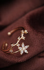A moment in nature, forever in gold. An open double band ring where a sculpted gold branch scattered with prong-set crystals meets a marquise crystal flower in full bloom delicate, poetic, and alive with detail. The ring that feels like spring on your finger.