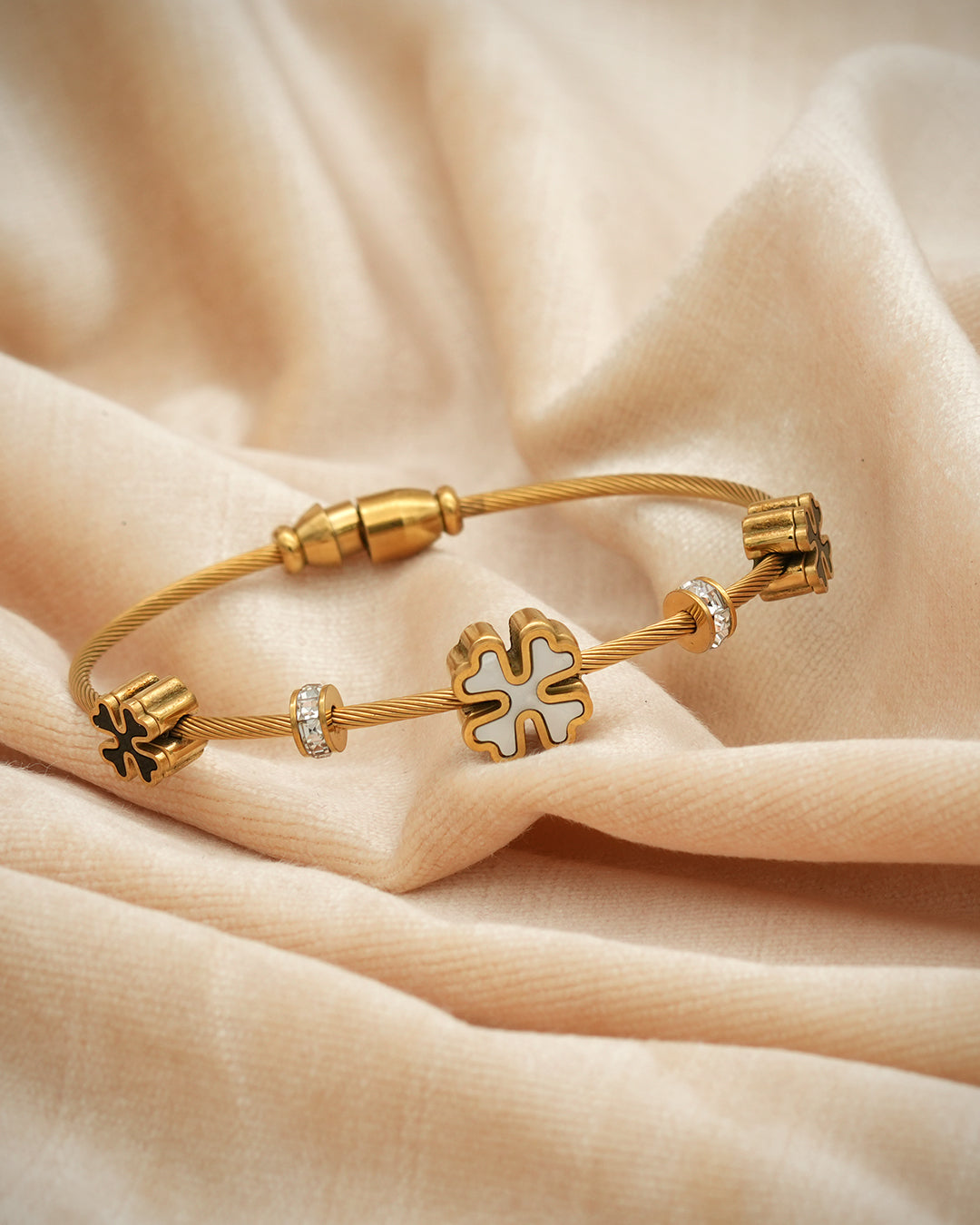 Twisted gold cable kada with alternating black and white enamel clover charms, crystal rondelle spacers, and a gold barrel magnetic clasp. Contrasting, playful, and effortlessly stackable.