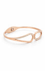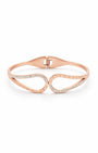 Rose gold plated kada with a crescent loop motif — Roman numeral etching, pavé crystal accents, and a secure hinge mechanism. The open-work, curved silhouette creates a light and airy feel on the wrist while making a sophisticated visual statement. Polished and precise from every angle.