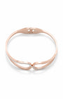 Fluid and symbolic. This rose gold plated kada features a striking bypass-inspired design where two teardrop loops gracefully meet at the center. One loop is precision-etched with classic Roman numerals, while the other is adorned with a delicate row of pavé-set crystals, offering a beautiful contrast between heritage and modern brilliance. Effortlessly artistic, quietly luxurious, made for every wrist.