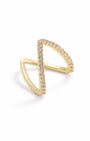 Two bands. One bold crossing. A sleek gold double band ring where two slim bands intersect in a sharp X, with the entire crossover bar set with prong-mounted sparkling crystals — graphic, architectural, and effortlessly cool. The ring that redefines how a stack looks.