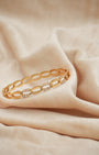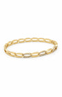 Fluid and rhythmic. This gold plated kada features a sophisticated chain-link motif, composed of interlocking oval rings that wrap gracefully around the wrist. The design is elevated by alternating links encrusted with shimmering pavé crystals, creating a beautiful contrast between high-polish gold and brilliant sparkle. A contemporary piece that moves with you. Effortlessly chic, quietly luxurious, made for every wrist.