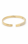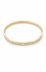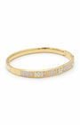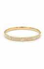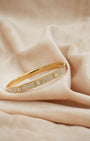 Gold plated kada with a hexagonal mosaic motif — square solitaire focal points, pavé crystal segments, and a secure hinge clasp. The flat, angular profile provides a modern, high-fashion take on the classic crystal bracelet. Polished and precise from every angle.