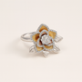 Inspired by the lotus, it features golden and rose-tinted petals layered around a pavé-set floral core, crowned with polished silver leaf motifs for a touch of serenity.