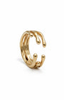 Gold caught mid-pour. An open triple band ring where three parallel tubular bands flow freely, each ending in organic molten drip tips fluid, fearless, and impossibly cool. The ring that makes people stop and ask where you got it.