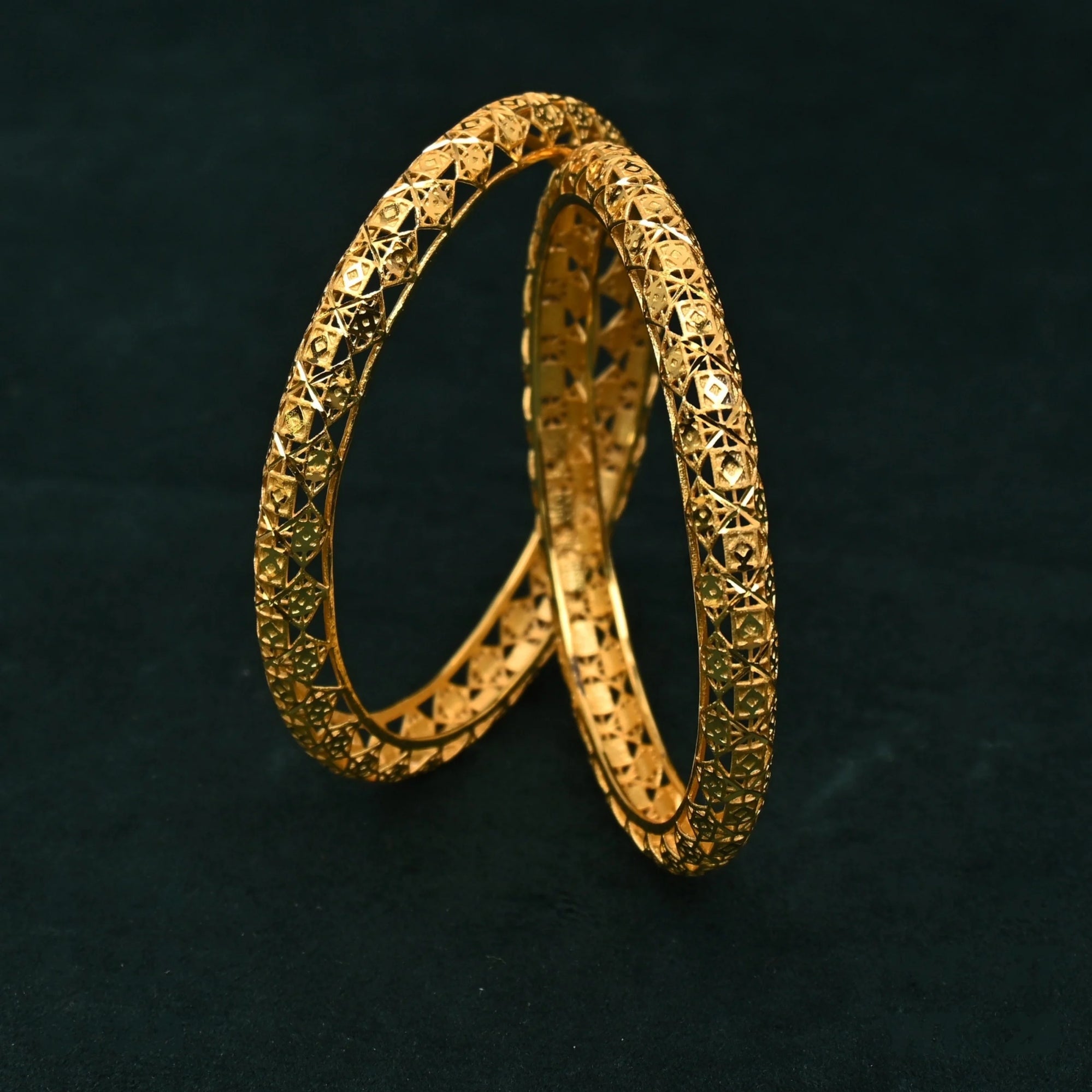 Elviora is an elegantly crafted bangle pair made in Silver 925 with a Gold Polished finish. The intricate engraved detailing lends it a refined and graceful traditional appeal. Includes lifetime warranty.