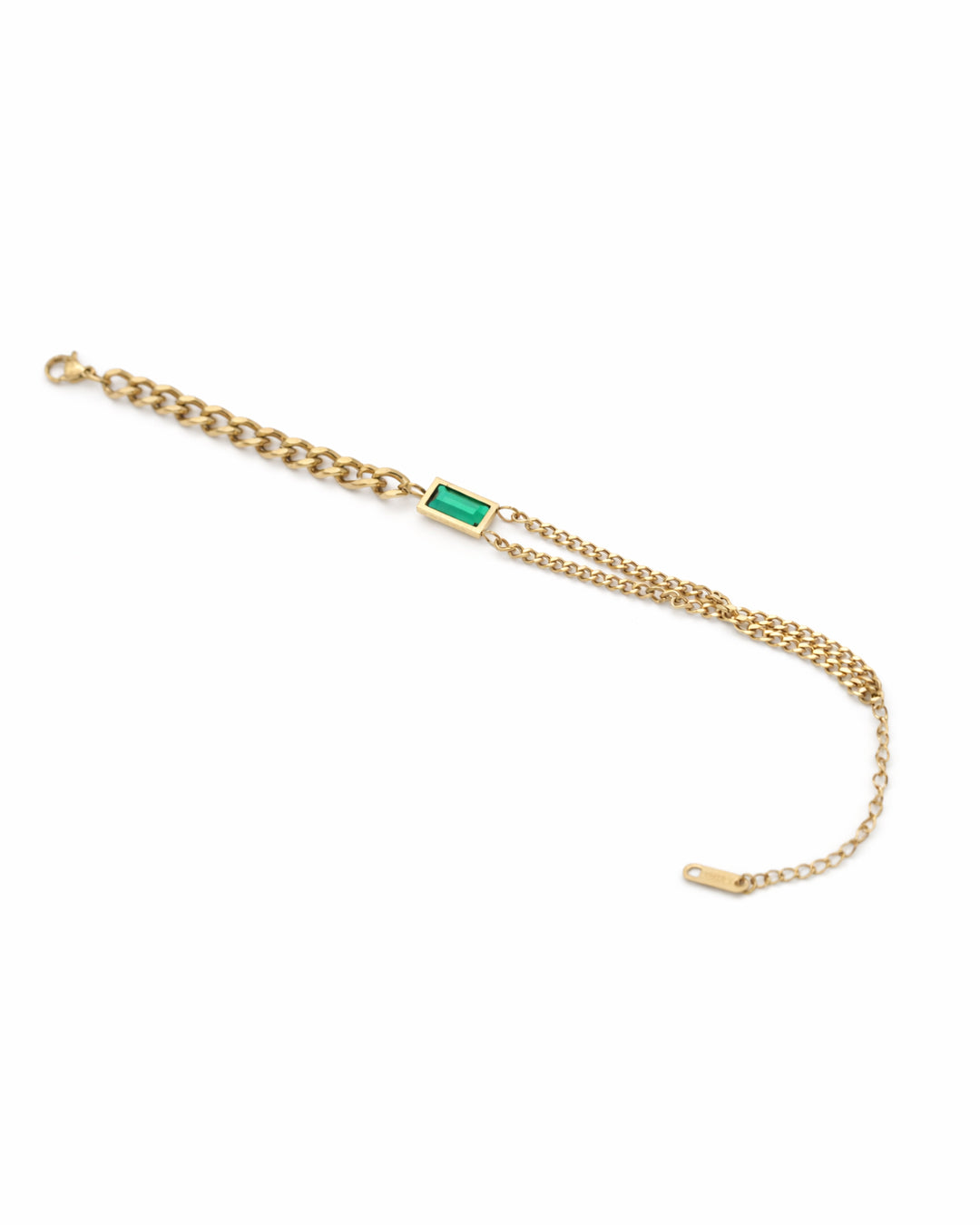 One stone. All the impact. A bold double curb chain bracelet anchored at its centre by a deep emerald green baguette crystal in a sleek gold bar setting where street-style edge meets precious-stone elegance. The contrast is intentional. The result is unforgettable.