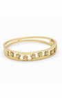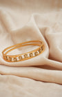 Architectural and airy. This gold plated kada features a sophisticated open-frame silhouette, where a continuous sequence of delicate floral motifs is suspended between two polished golden rails. Each petite flower is centered with a shimmering crystal, creating a beautiful play of negative space and radiant light. Effortlessly modern, quietly luxurious, made for every wrist.