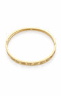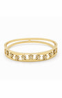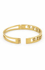 Gold plated kada with a floral cut-out motif — open split-rail architecture, crystal-accented blooms, and a secure hinge clasp. The structured yet breathable design offers a contemporary twist on classic botanical jewelry. Polished and precise from every angle.