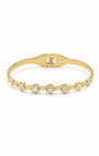 Crafted in premium stainless steel with an 18k gold plated finish. Features a wide flat polished bangle band with a spring-hinge oval plate clasp and a centrepiece row of alternating solid gold flower motifs and fully pavé crystal-set flower motifs across the front protected by our anti-tarnish technology for lasting brilliance.