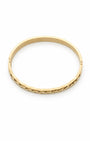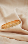Gold plated kada with a laurel leaf motif — textured embossed pattern, high-shine finish, and a secure hinge mechanism. The medium-width band offers a sturdy yet refined silhouette that highlights the artisanal craftsmanship of the metalwork. Polished and precise from every angle.