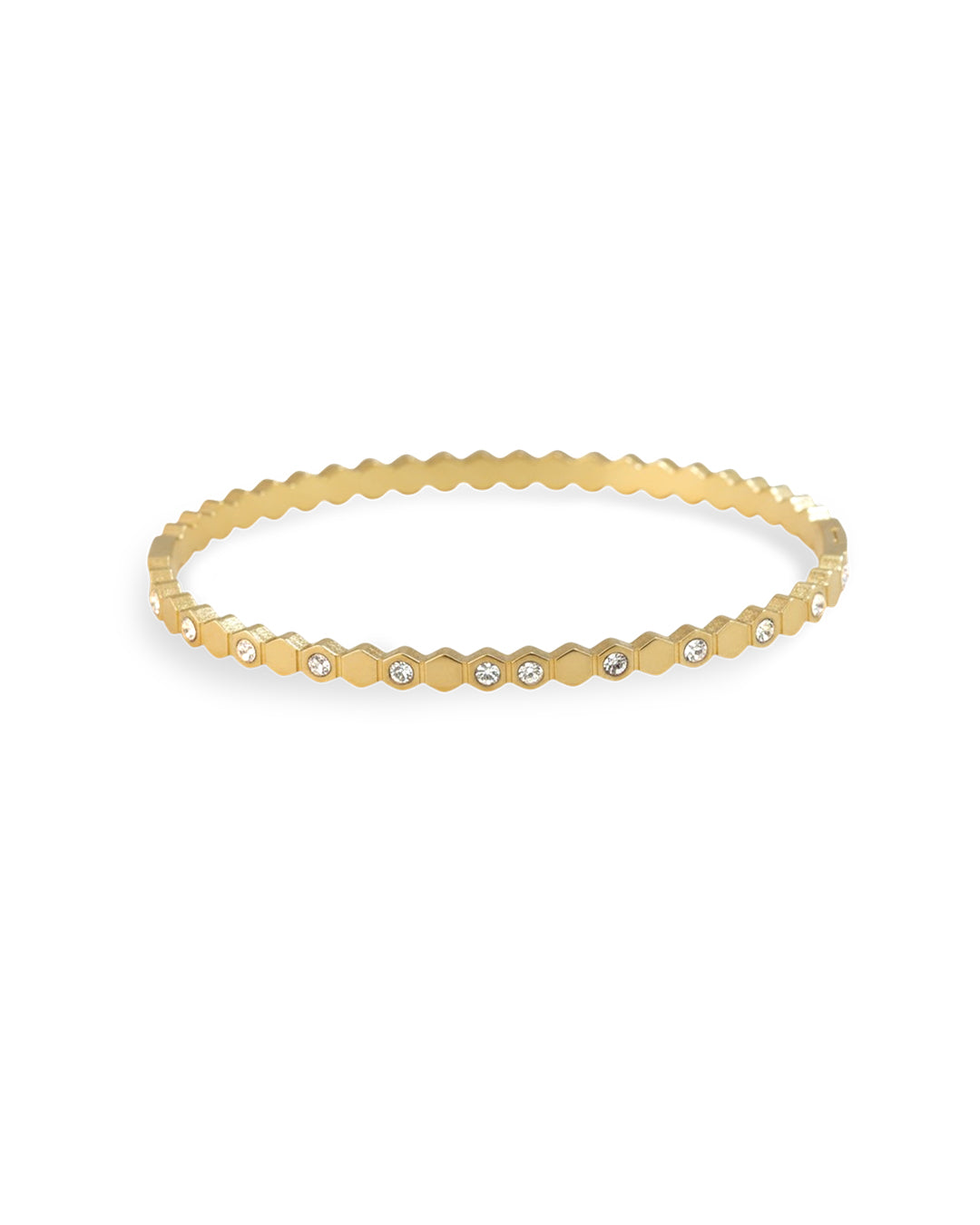 Structure meets sparkle, all the way around. A slim gold bangle crafted entirely from continuous hexagon links, with bezel-set crystals nestled between each facet geometric precision meets effortless shine. Minimal enough to stack, striking enough to wear alone.