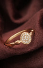 A circle of light, worn with intention. A delicate scalloped gold band crowned with a round pavé crystal disc — radiant, refined, and quietly captivating. The kind of ring that catches the light before you even lift your hand.