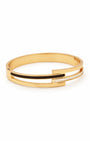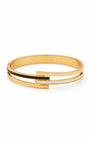 Linear and avant-garde. This gold plated kada features a striking bypass silhouette defined by clean, horizontal lines and a modern split-rail band. The design is elevated by high-contrast monochrome inlays—one rail finished in sleek black enamel and the other in luminous white—creating a sophisticated geometric balance. A statement of contemporary luxury. Effortlessly bold, quietly luxurious, made for every wrist.