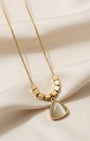 Crafted in premium stainless steel with an 18k gold plated finish. Features a triangle mother of pearl stone in a gold bezel setting, accented by an arc of smooth gold cube beads on a flat snake chain — all protected by our anti-tarnish technology for lasting shine.
