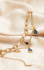 Evil eye, sapphire teardrop, and moon charms on a double-layer paperclip and curb chain gold bracelet, with lobster clasp and adjustable extender. Bold, mystical, and effortlessly layered.