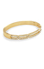 Wide polished gold bangle with hinge clasp and an open oval pavé crystal link panel front chain-link silhouette with full pavé crystal border detailing. Refined, luminous, and timelessly sophisticated.