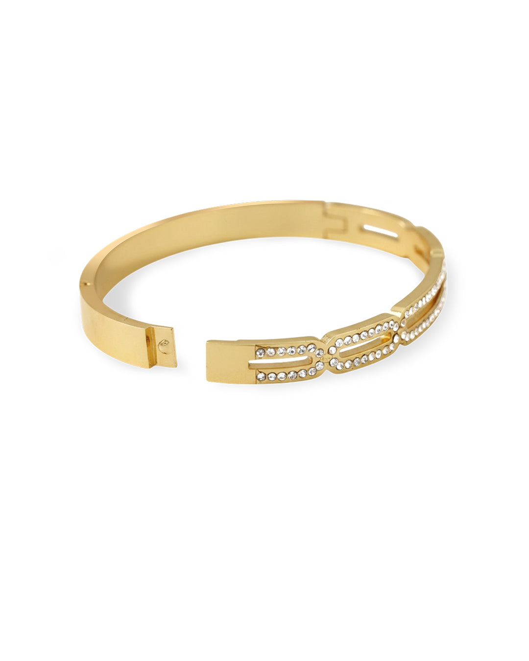 Crafted in premium stainless steel with an 18k gold plated finish. Features a wide flat polished bangle band with a hinge clasp and a front panel of open oblong oval link frames, each border fully set with pavé crystals in a chain-link arrangement protected by our anti-tarnish technology for lasting brilliance.
