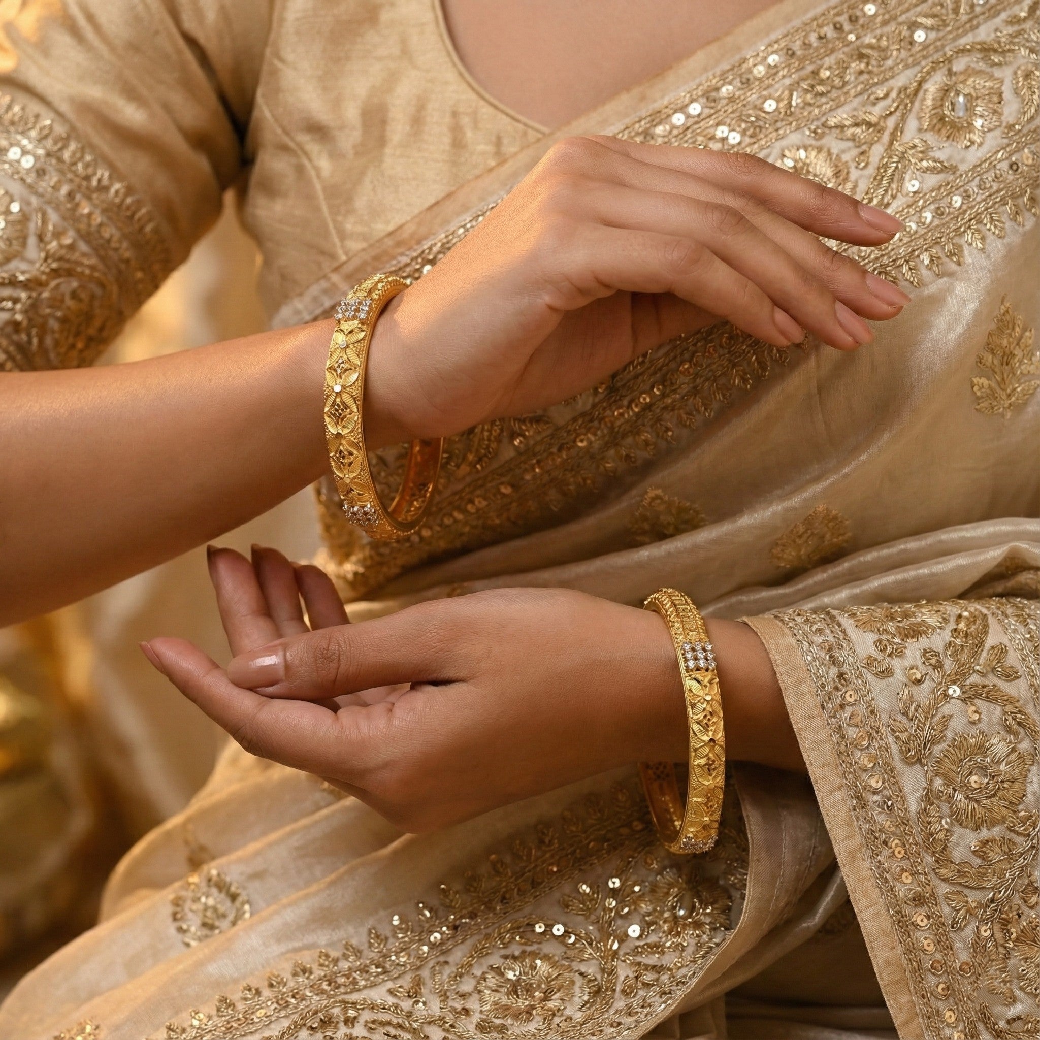 Sorvaya is a heritage-style bangle pair crafted in Silver 925 with a Gold Polished finish. The engraved detailing and subtle stone accents add an elegant traditional character. Includes lifetime warranty.