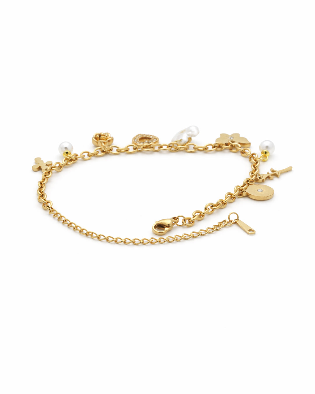 Multi-charm bracelet with pearl, crystal heart, rose, butterfly, cross, daisy, and coin charms on a bold gold cable chain, with lobster clasp and adjustable extender. Playful, eclectic, and full of personality.