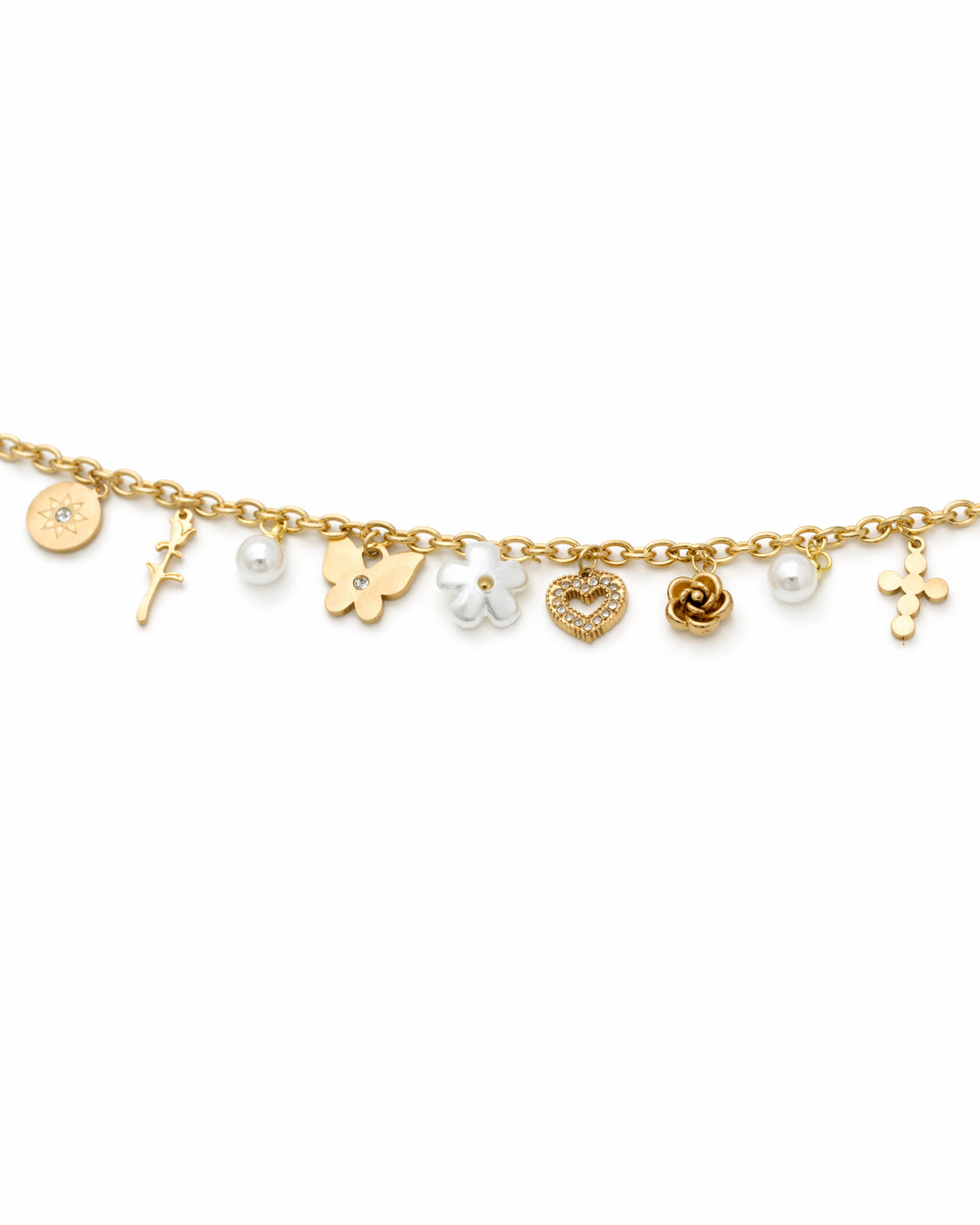 Crafted in premium stainless steel with an 18k gold plated finish. Features a curated collection of charms including a pave crystal heart, gold rose bud, butterfly, cross, acrylic daisy flower, coin disc, faux pearl beads, and a gold ball on a chunky gold cable chain, protected by our anti-tarnish technology for lasting shine.